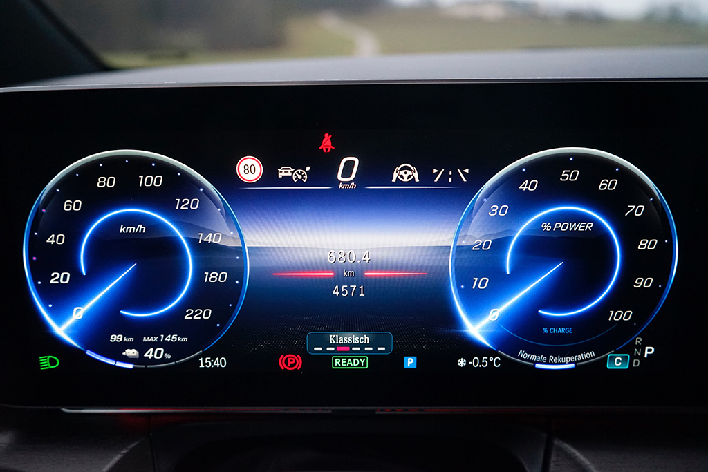 Im Alltag kommen wir mit dem EQV 300 Lang auf einen getesteten, winterlichen Stromverbrauch von rund 26 kWh pro 100 Kilometer. Angesichts von Größe, Gewicht und Innenraumvolumen ist das ein erfreulich guter Wert, der zeigt, dass elektrisches Reisen in dieser Fahrzeugklasse durchaus effizient sein kann. Die nutzbare Batteriekapazität von 93,3 kWh ermöglicht damit praxisgerechte Reichweiten, die auch längere Tagesetappen problemlos zulassen, wenn man die Ladepausen sinnvoll plant.