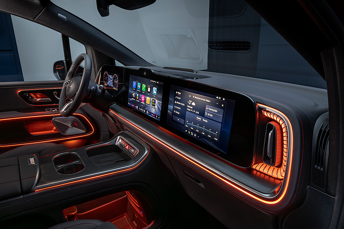 Die technische Brillanz zeigt sich dabei nicht nur im sichtbaren Luxus, sondern tief in den digitalen Genen des Fahrzeugs, die durch das KI-gesteuerte Mercedes-Benz Operating System (MB.OS) zum Leben erweckt werden. Im Cockpit erstreckt sich der MBUX Superscreen über die gesamte Breite, während im Fond auf Wunsch ein gigantischer 79-Zentimeter-Panorama-Screen aus dem Dachhimmel gleitet, um die Passagiere mit 8K-Auflösung in immersive Welten zu entführen. Dabei reagiert der neue MBUX Virtual Assistant dank ChatGPT- und Google Gemini-Integration fast wie ein informierter Freund auf komplexe Gespräche und Wünsche. Ob man per App ein „Sitzballett“ choreografiert, bei dem sich die elektrischen Sessel wie von Geisterhand in die perfekte Position für ein Videomeeting verschieben, oder ob man die manuellen „Roll & Go“-Sitze mit einem Handgriff entfernt, um Platz für die Sportausrüstung zu schaffen – die Variabilität kennt kaum noch Grenzen.