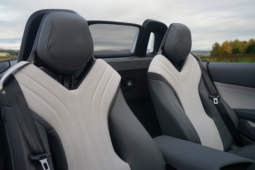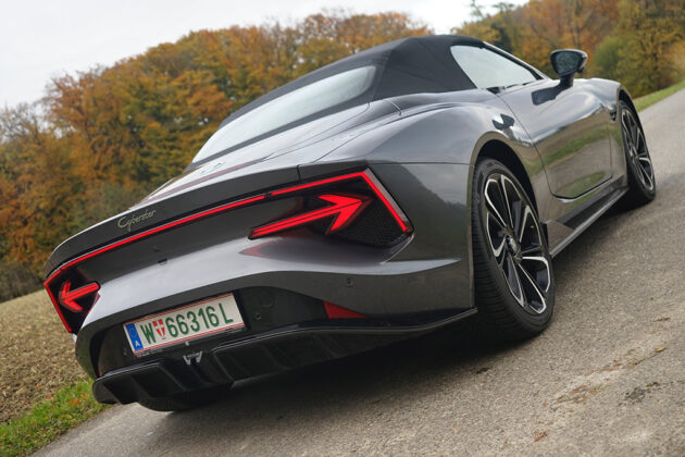 Wir öffnen die Scherentüren, lassen das Stoffverdeck elektrisch nach hinten gleiten und spüren sofort, dass dieser Roadster nicht einfach E-Mobilität verspricht, sondern pure Emotion – made in China!
