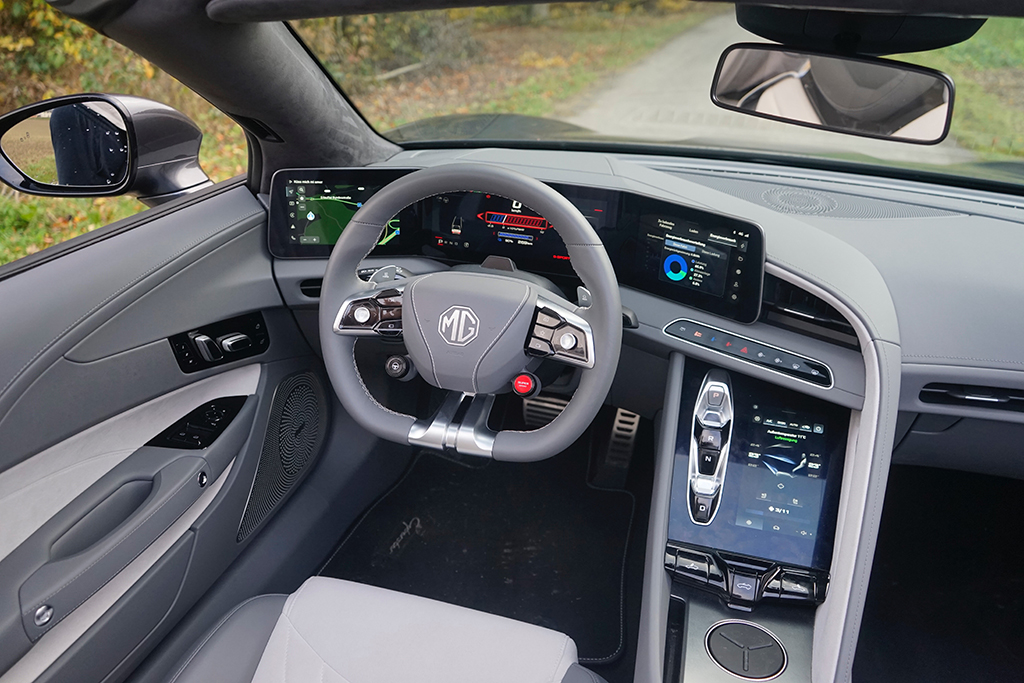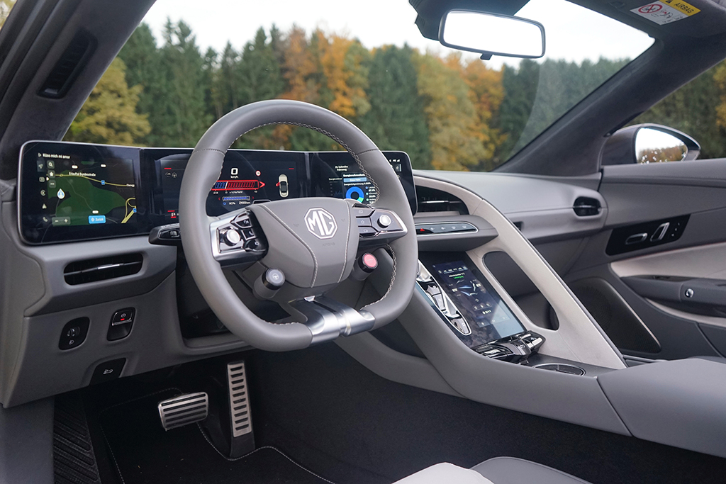 Unter der Oberfläche arbeitet im GT die stärkste Motoren-Ausbaustufe: 375 kW / 510 PS und 725 Nm, verteilt auf zwei E-Aggregate und Allradantrieb. Wir drücken das Fahrpedal – und der MG beschleunigt, als hätte jemand eine gespannte Feder losgelassen. Unter Launch Control Steuerung beamen wir uns in knapp über drei Sekunden von 0 bis 100 km/h, begleitet vom „tiefen Druck“, den nur E-Power so unmittelbar liefern kann. Und die abgeregelte Höchstgeschwindigkeit von 200 km/h ist sofort erreicht. Trotz seiner knapp zwei Tonnen wirkt der Cyberster GT extrem agil, besonders im „Super Sport“-Modus. Lenkung, Dämpfung und Ansprechverhalten werden schärfer, das Auto fühlt sich noch lebendiger an, geradezu leichtfüßig. Auf kurvigen Landstraßen fahren wir mit einem Dauergrinsen – Roadster-Fahrspaß in einer überspannenden Mischung aus MG-Tradition und Zukunft. Ob in Fahrt oder am Stand – der MG begeistert die Passanten wann und wo immer er auftaucht!