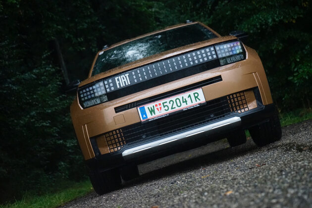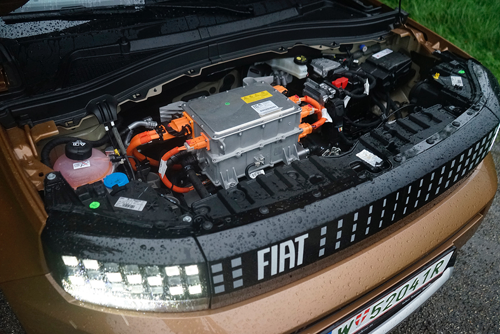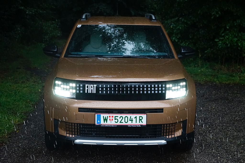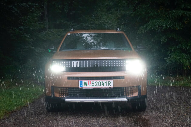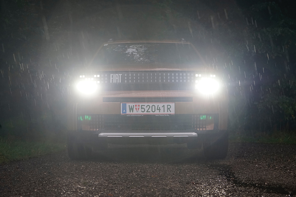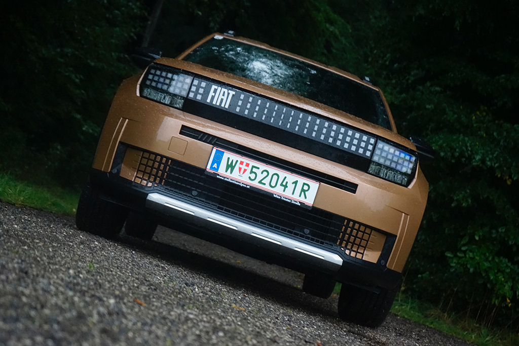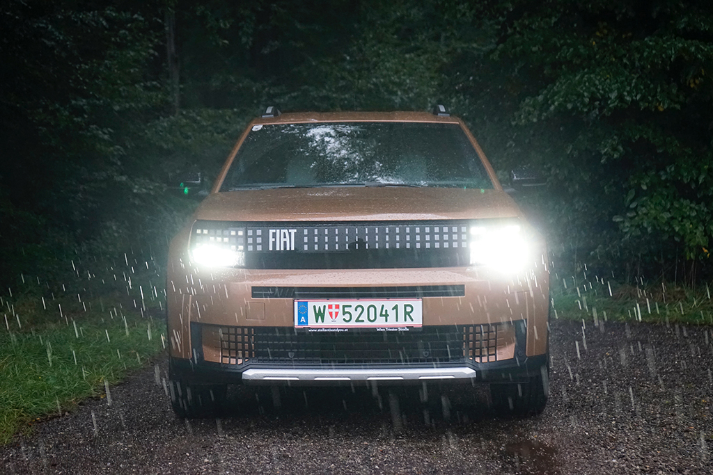 Beim Laden zeigt sich der Grande Panda besonders clever. An einer Wallbox lädt er mit 11 kW, an einer Schnellladesäule nimmt er bis zu 100 kW Gleichstrom auf – damit schaffen wir den üblichen 20-bis-80-Prozent-Bereich in rund 30 Minuten. Dazu passt das Panda-typische Detail: Unter der vorderen Haube sitzt ein fix integriertes, aufgerolltes Not-/Langsamlade-Kabel für Haushalts- und Parkhaussteckdosen. Kein loses Kabel im Kofferraum, kein Suchen, einfach plug-and-go. Ein kleines, aber sehr alltagsstarkes Feature, das widerum den „einfach, aber genial“-Gedanken des Originals aufnimmt. Im gemischten Testbetrieb bewegt sich der Verbrauch im Bereich von etwa 15,5–17,5 kWh/100 km, natürlich klar abhängig vom Fahrprofil.