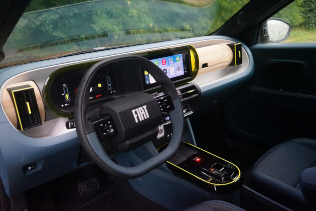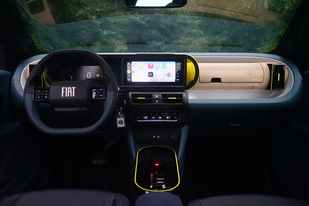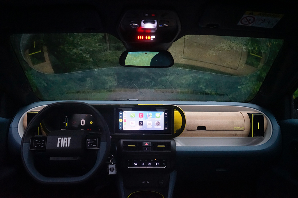 Wir sitzen aufrecht und mit sehr guter Übersicht – typisch Panda-Gene. Das horizontale Armaturenbrettband erinnert klar an das legendäre Ablagebrett des Ur-Panda, damals schlichtes Hartplastik, heute aus Bambusfasern inklusive Bambox als moderne, offene Ablagezone mit Smartphone-Fächern und praktischen Stauräumen gestaltet. Funktional, ehrlich, einfach – und das steht ihm hervorragend. Vor uns liegt ein rund 10-Zoll-Digitaldisplay, daneben ein 10,25-Zoll-Touchscreen inklusive Navigationssystem mit kabelloser Smartphone-Integration. In der von uns gefahrenen La-Prima-Version kommen Klimaautomatik, Keyless-Go, kabelloses Laden, Rückfahrkamera sowie Front- und Parksensoren hinzu. Die vorderen Sitze sind beheizbar, die Stoffbezüge wirken robust und freundlich. Alles fühlt sich zweckmäßig, aber sympathisch an – kein Tech-Zirkus, sondern alltagstauglich gedacht.
