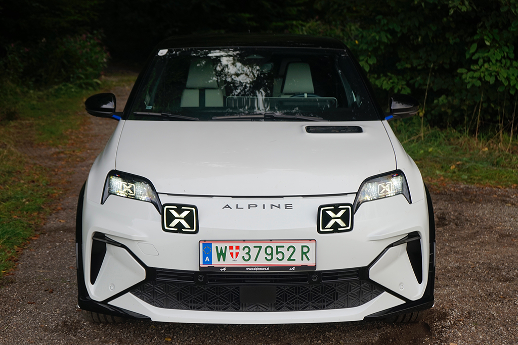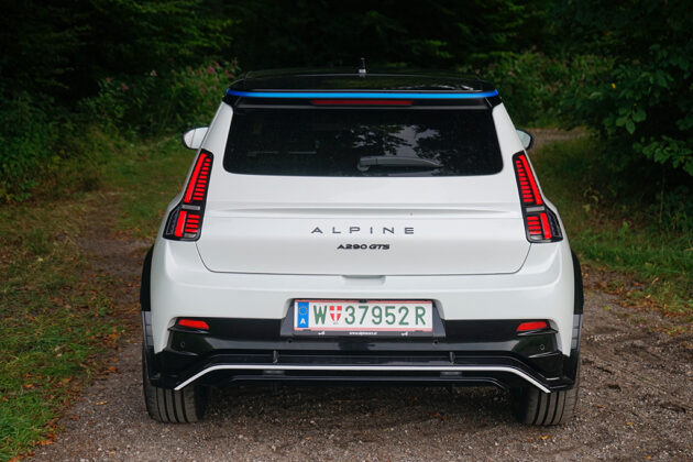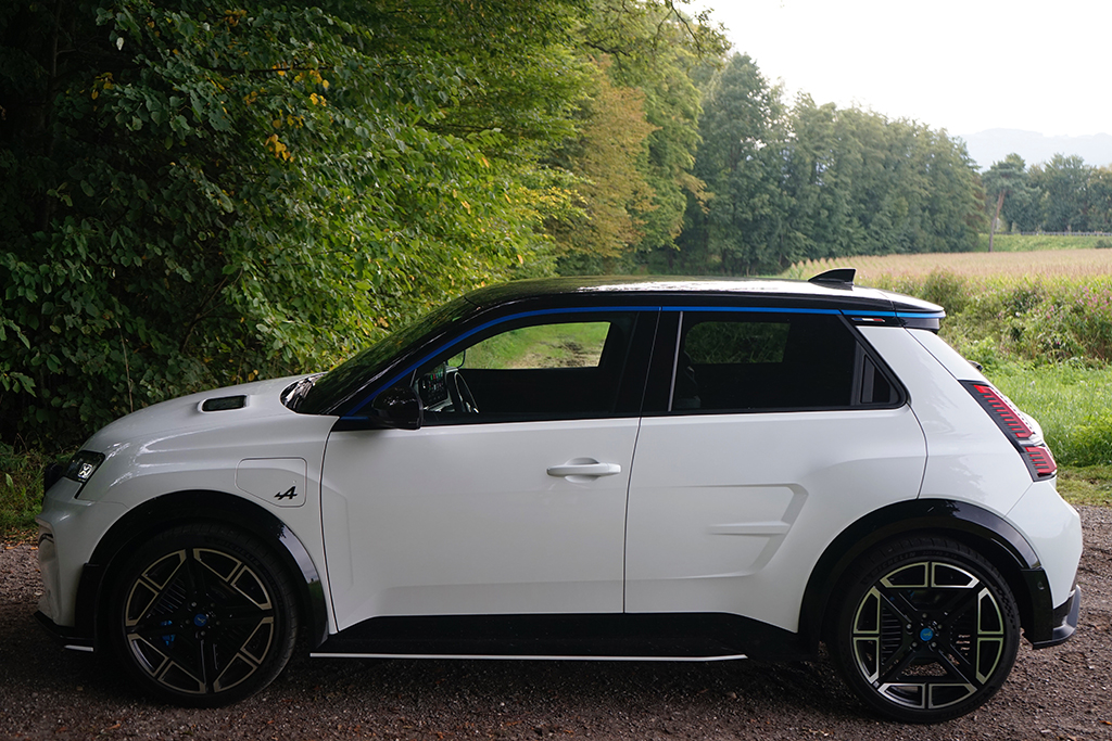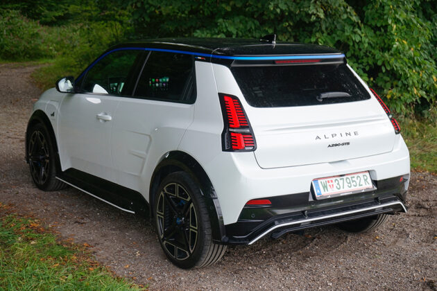 Schon von außen macht der A290 klar, dass er nicht einfach ein normaler Kleinwagen ist. Die Proportionen wirken gedrungen, das Fahrzeug steht breit und duckt sich gleichzeitig sportlich auf die Straße. Unser Testwagen trägt die elegante Lackierung in Perlmutt-Weiß, schwarze Akzente setzen einen markanten Kontrast. Dazu kommen die optionalen 19-Zoll-“Iconic“-Felgen, die dem kompakten Elektro-Sportler eine gehörige Portion Dynamik verleihen. Kleine Details wie die französische Flagge auf der C-Säule oder die blauen Radnabendeckel setzen charmante Akzente – typisch französische Liebe zum Detail. Besonders auffällig sind die Bremssättel in Alpine-Blau, die durch die filigranen Felgen schimmern und sofort Lust auf eine flotte Runde machen.