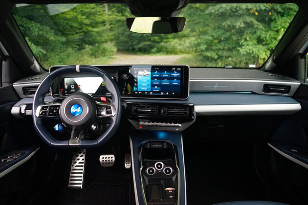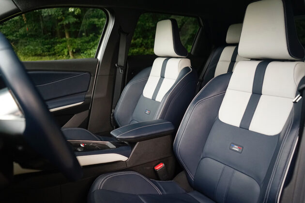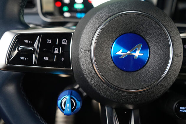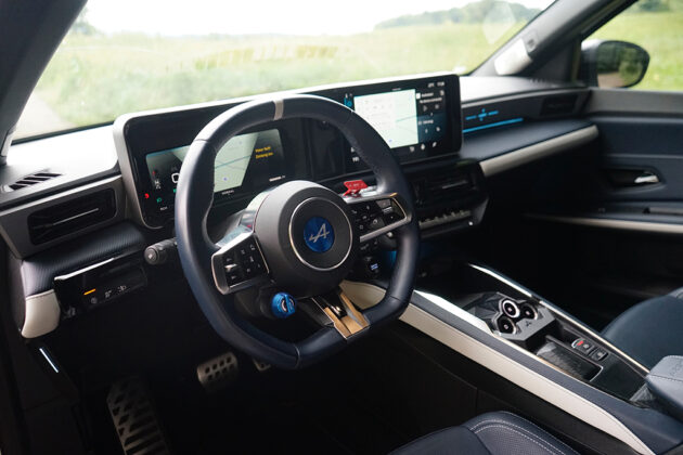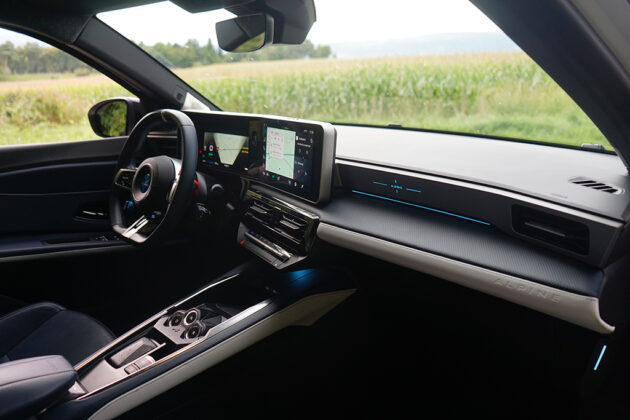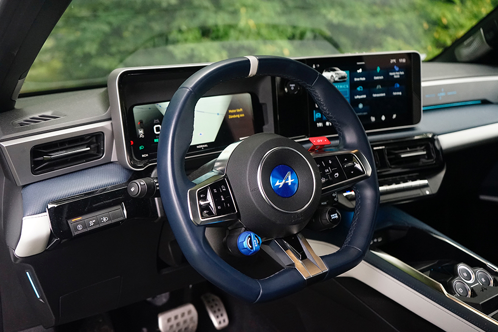 Im Cockpit geht es sportlich wie stilvoll weiter. Uns begrüßt eine hochwertige Nappaleder-Polsterung in Deep Blue und Evee Grey, veredelt mit Alpine-Nähten und dezenten Monogrammen. Schon beim Hinsetzen spüren wir die tiefe Sitzposition und die gute Seitenführung der Sitze – genau richtig für sportliche Fahrten. Vor uns präsentiert sich das kompakte Multifunktionslenkrad, auf Wunsch mit Alpine-Logo in Blau in der Nabe, und dahinter ein digitales Fahrerdisplay. Zentral thront ein 10,1-Zoll-Touchscreen mit Google-Navigation und sämtlichen Services. Das Devialet-Soundsystem liefert satten Klang, und gleichzeitig ist die Bedienung durch das Alpine Portal angenehm intuitiv. Praktische Features wie Sitz- und Lenkradheizung oder die Wärmepumpe zeigen, dass Komfort trotz Sportfokus nicht vernachlässigt wird.