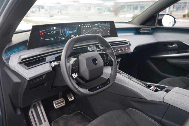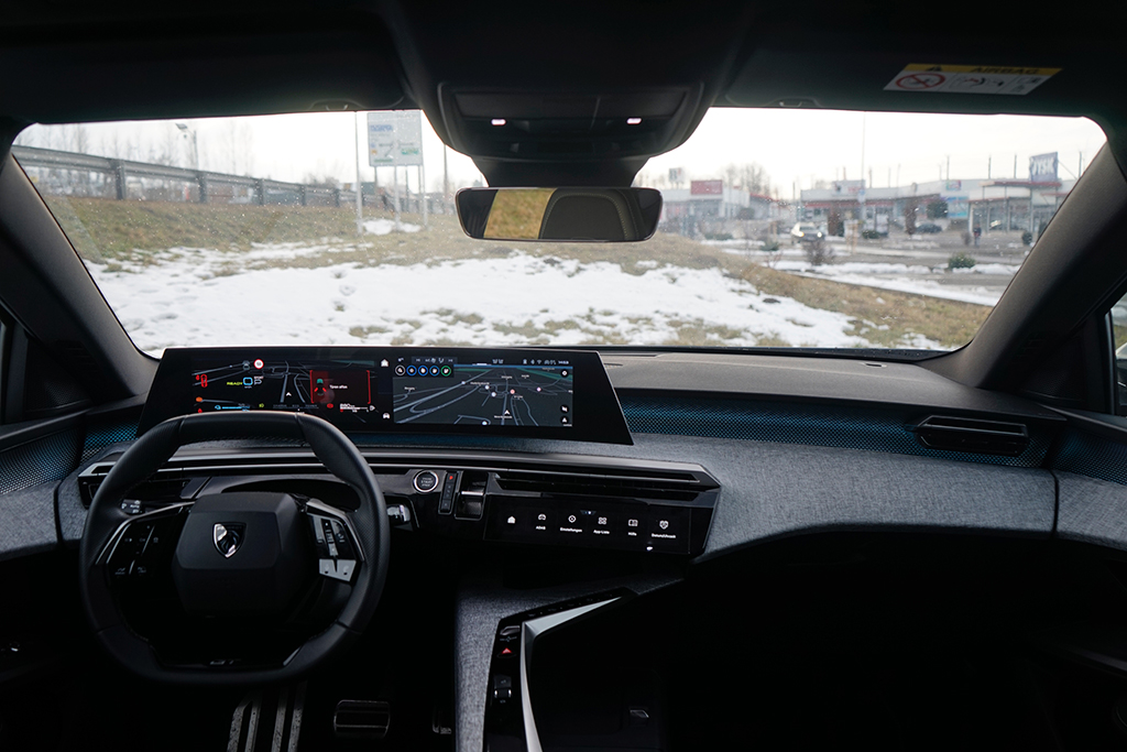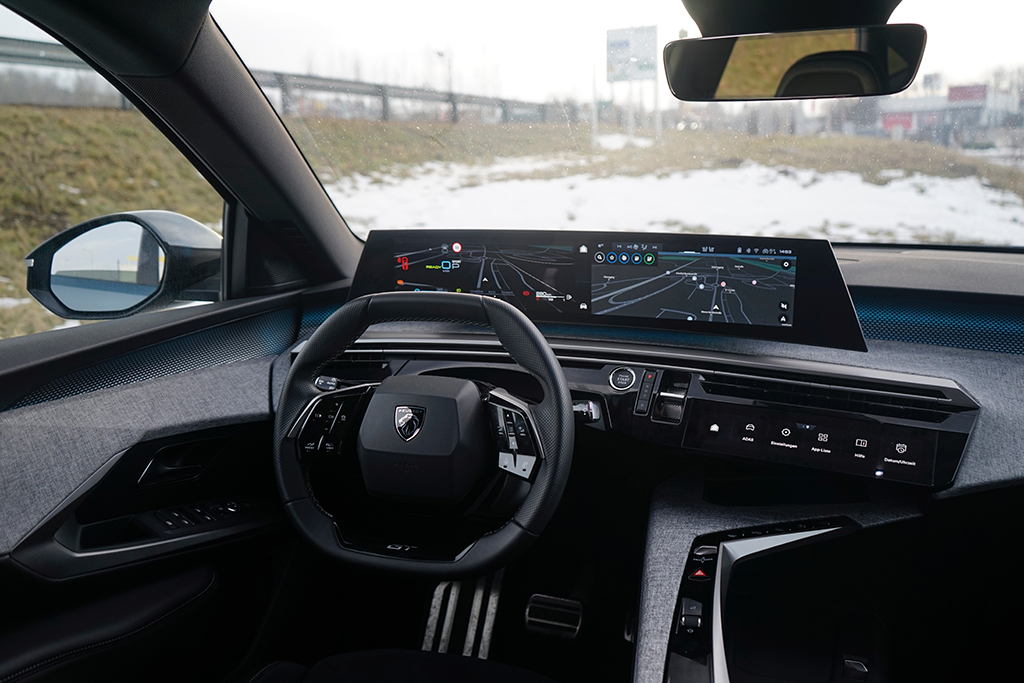 Im Innenraum zeigt sich der typische Peugeot-Ansatz besonders deutlich. Das i-Cockpit ist nach wie vor das prägende Element. Das kleine, tief platzierte Lenkrad liegt kompakt in der Hand und passt zur recht sportlichen Sitzposition. Der Blick fällt darüber hinweg auf das digitale Kombiinstrument mit 12,3 Zoll Bildschirmdiagonale, das Informationen klar, kontrastreich und hochwertig darstellt. Zentral im Armaturenbrett sitzt der 10 Zoll große Touchscreen für Infotainment und Navigation. Die Menüführung ist logisch aufgebaut, die Reaktionen sind schnell, die Darstellung modern und übersichtlich.