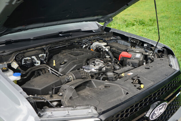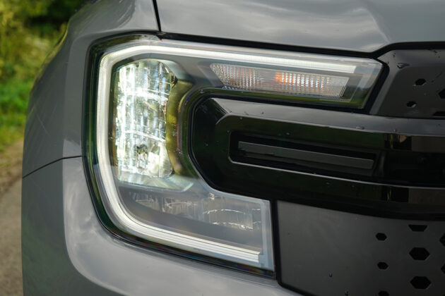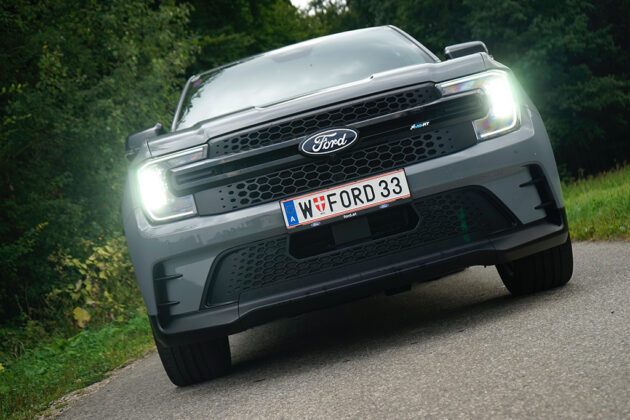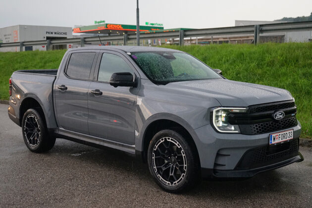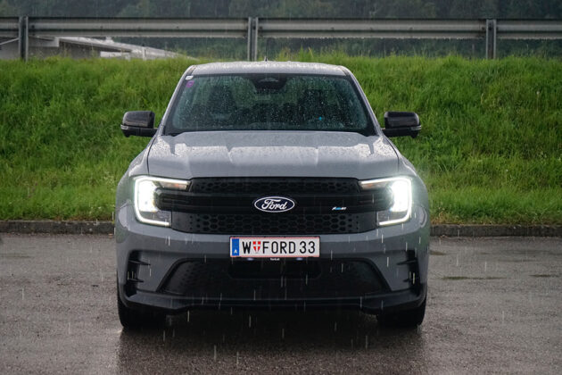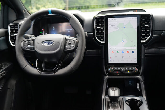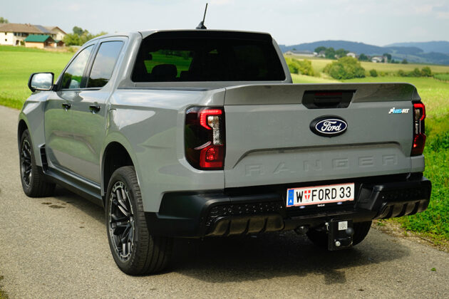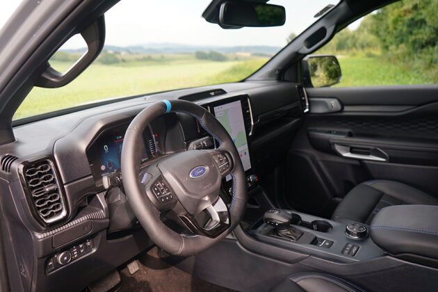 Auf der Landstraße überrascht der Ranger mit Dynamik. Die sportlich abgestimmte Federung und die Niederquerschnittsreifen lassen ihn deutlich präziser wirken als herkömmliche Pick-ups. In schnell gefahrenen Kurven liegt er satt, das Volant vermittelt erstaunlich viel Rückmeldung. Fast vergisst man die zwei Tonnen Gewicht – bis eine enge Parklücke oder eine schmale Tiefgaragenzufahrt daran erinnert, dass man hier ein Dickschiff bewegt. Komforttechnisch verlangt er kleine Zugeständnisse: Querfugen und Schlaglöcher spürt man deutlicher, aber das gehört zum Charakter.
