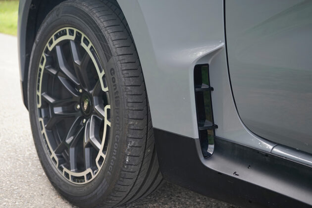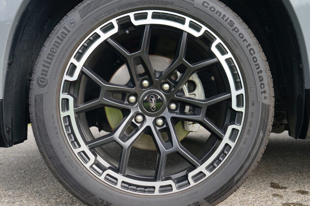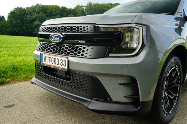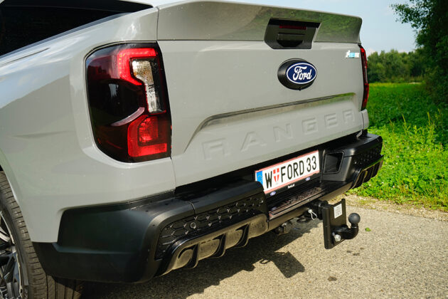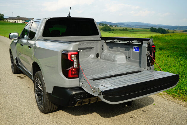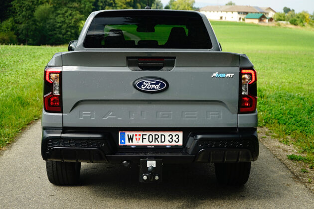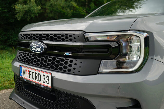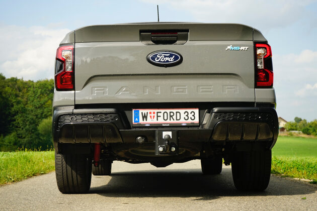 Das Exterieur wirkt so, als hätte Ford seinem Bestseller ein Motorsport-Stylingpaket geschnürt: Die verbreiterten Kotflügel, die muskulösen Schürzen und der Diffusor am Heck lassen vergessen, dass wir hier eigentlich einen klassischen Lastenträger fahren. Unser Testwagen im eleganten Conquer Grey zeigt sich als echtes Statement – bullig, fast schon einschüchternd, und dennoch mit einer gewissen Eleganz. Die riesigen 21-Zoll-„Schlappen“ füllen die Radkästen perfekt aus, während kleine Spoilerelemente und Finnen aerodynamische Akzente setzen. Trotz aller Show bleibt er praktisch: Ladefläche groß, Heckklappe stabil, Verzurrösen robust – der Ranger kann nach wie vor „schuften“, wenn man ihn lässt.