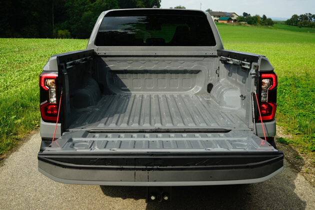 Gerade hier lohnt sich ein Blick auf die nackten Zahlen: Die Ladefläche misst rund 1,57 Meter in der Länge und 1,58 Meter in der Breite, zwischen den Radkästen bleiben immerhin 1,22 Meter. Damit lassen sich Europaletten problemlos verstauen. Die Höhe der Bordwände von knapp 50 Zentimetern erleichtert das Sichern von Ladung, und mit einem Ladevolumen von gut 1,23 Kubikmetern bleibt reichlich Stauraum für Werkzeug, Sportgeräte oder Baustellenmaterial. Die Heckklappe lässt sich leicht öffnen und absenken, LED-Ladeflächenbeleuchtung sowie praktische Verzurrösen gehören zum guten Ton. Wer will, kann die Ladefläche mit Zubehörsystemen modular erweitern – vom Hardtop über ausziehbare Schubladen bis zur Stromversorgung. Der MS-RT zeigt also: Showcar ja, aber keineswegs ohne Substanz.