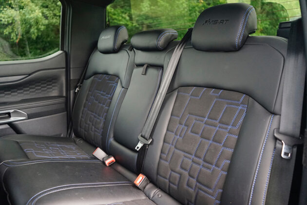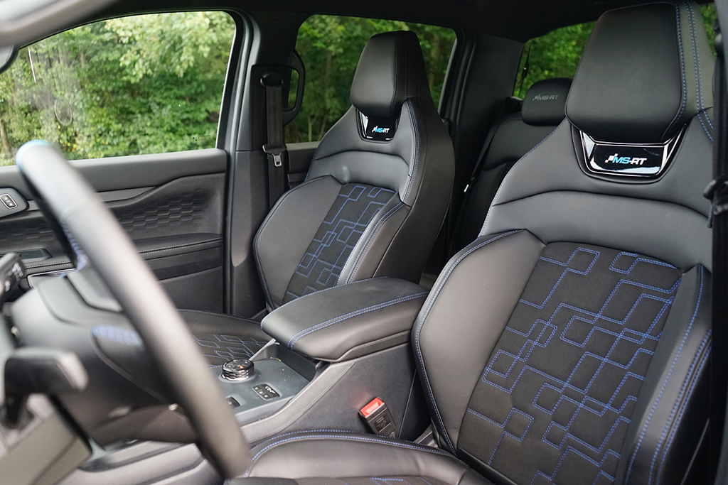 Das Interieur überrascht mit einer Mischung aus Noblesse und Sportlichkeit, die man in dieser Klasse kaum erwartet. Schon beim Einsteigen fällt die erhöhte Sitzposition angenehm auf, sie vermittelt Überblick und Souveränität. Das Volant mit abgeflachtem Kranz liegt perfekt in der Hand, die 12-Uhr-Markierung gibt sportliche Orientierung. Dahinter spannt sich das 12-Zoll-Instrumentendisplay auf, gestochen scharf und frei konfigurierbar. Mittig thront ein 12-Zoll-Touchscreen im Hochformat, der fast wie ein Tablet wirkt und sämtliche Funktionen von Navigation bis Entertainment bündelt. Die Bedienung ist dank klarer Menüstruktur einfach, dazu gibt es Drehregler für die wichtigsten Klimafunktionen – eine Wohltat im Alltag. Die Sitze sind mit einer Mischung aus Kunstleder und Suedine bezogen, die Haptik erinnert beinahe an Premium-SUVs. Kontrastnähte, MS-RT-Prägungen und eine sportliche Formgebung verleihen Charakter, während die Seitenwangen für ordentlichen Halt sorgen. Dank Komfortpaket finden wir eine elektrische Verstellung, Sitzheizung und sogar eine Lenkradheizung vor – kleine Luxusdetails, die man in einem Pick-up nicht unbedingt erwartet. Auch das Platzangebot überzeugt: Vorne genießen wir üppige Bewegungsfreiheit, hinten sitzen Erwachsene bequem mit ausreichendem Beinraum und einer Sitzbank, die längerem Reisen standhält. Zahlreiche Ablagen, USB-Anschlüsse und sogar eine 230-Volt-Steckdose erhöhen den Alltagswert. So ist das Interieur nicht nur hübsch anzusehen, sondern auch clever durchdacht.